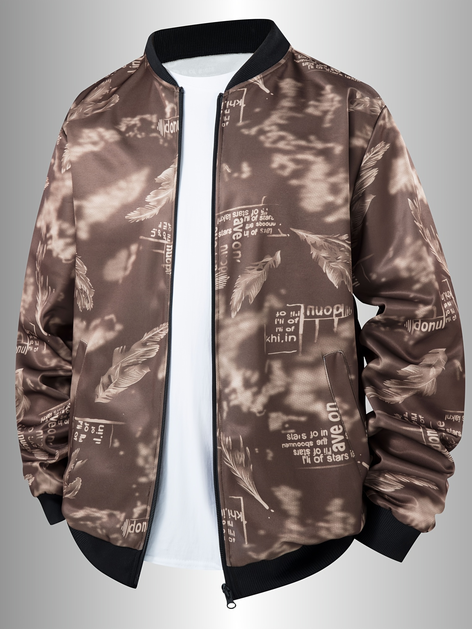 Men's Spring/Summer Baseball Collar Jacket, Lock Edge Lightweight Jacket, Knitted Polyester Braid Micro Elastic Feather Printed Jacket, Lightweight Fashion Casual Jacket, College Style Jacket