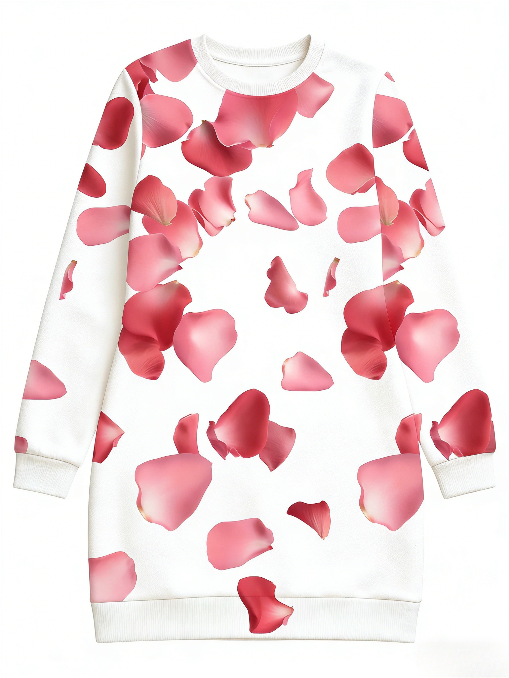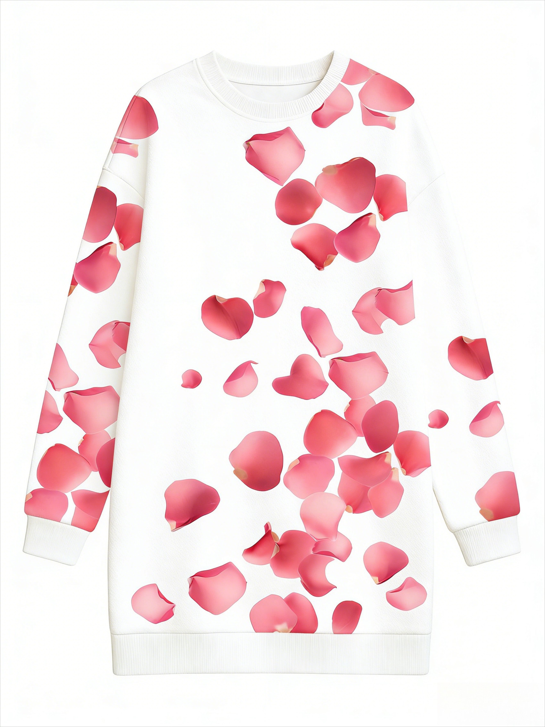 Plus Size Women'S Autumn Winter Hoodie Bodycon Dress | White Base with Pink Rose Petal Scattered Pattern, Sweet Romantic Style, Slim Fit, Long Sleeve, Pullover, Midi Length, Crew Neck, Casual Date Versatile Comfortable