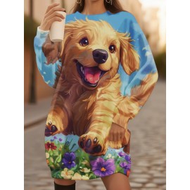 Plus Size Women'S 3D Printed Golden Retriever Puppy & Floral Sweatshirt - All-Over Print Cozy Winter Warm Pullover, Loose H-Line Fit Crew Neck Sweater with Cute Dog Lover Design, Machine Washable Casual Sweater for Fall/Winter Outfits