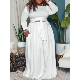 Plus Size Maxi Dress with Cutout Waist & Tie Front - Elegant Long Sleeve Wrap Front Evening Gown, Fit and Flare -Line Dress Suitable for Weddings, Parties, Prom - Solid Color Dress with Crew Neck & Slight Stretch Fabric