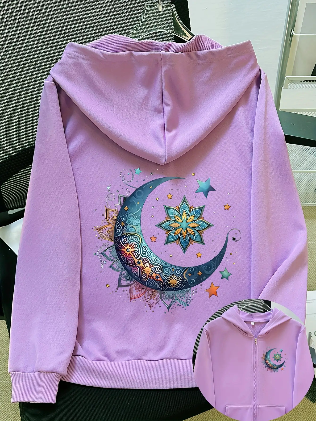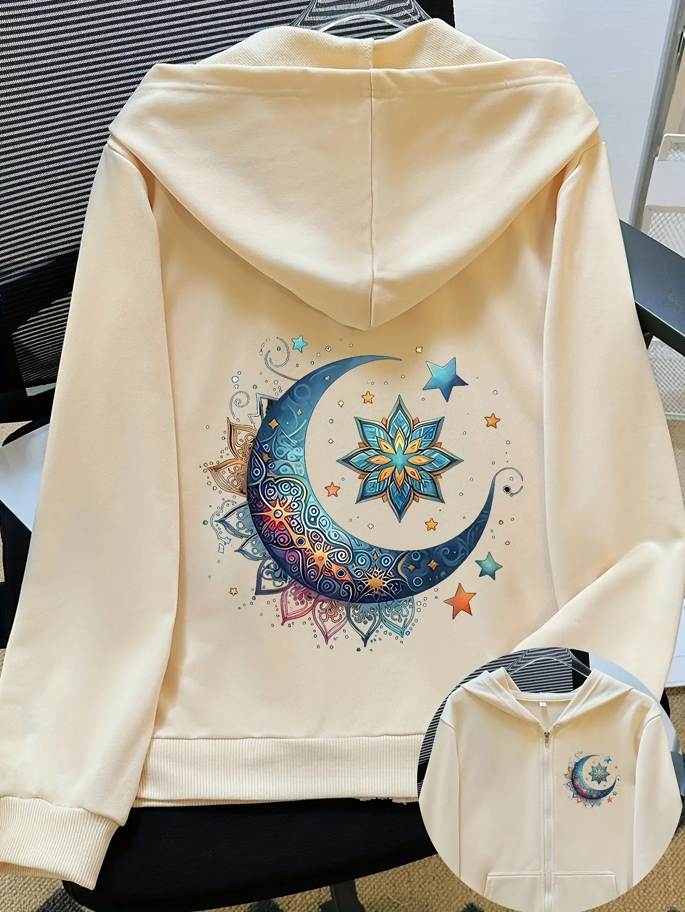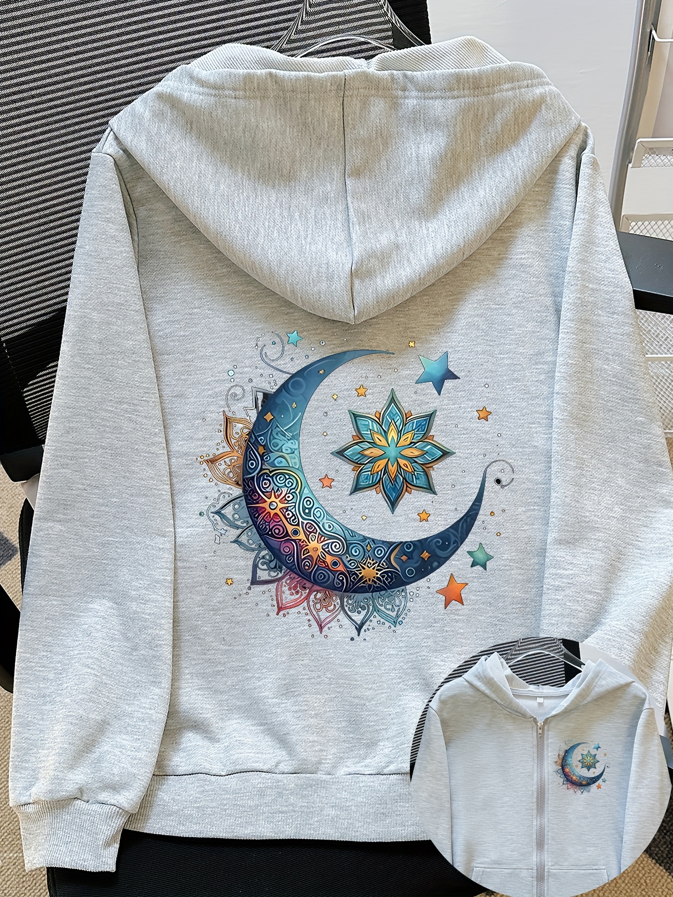 Women'S Light Pink Celestial Night Sky Hooded Jacket - Stretch All-Season Coat with Moon & Stars Back Print, Bohemian-Inspired Design, Machine Washable Casual Outerwear, Drawstring Hood & Long Sleeves for Everyday to Special Occasions (No Belt Requi