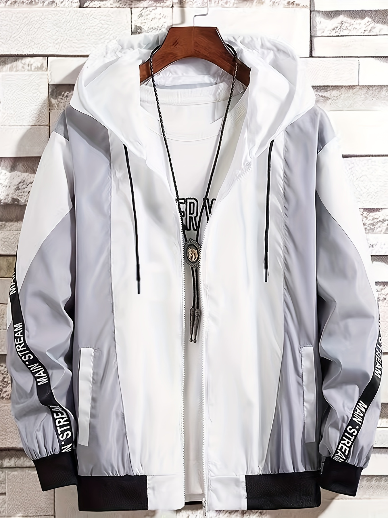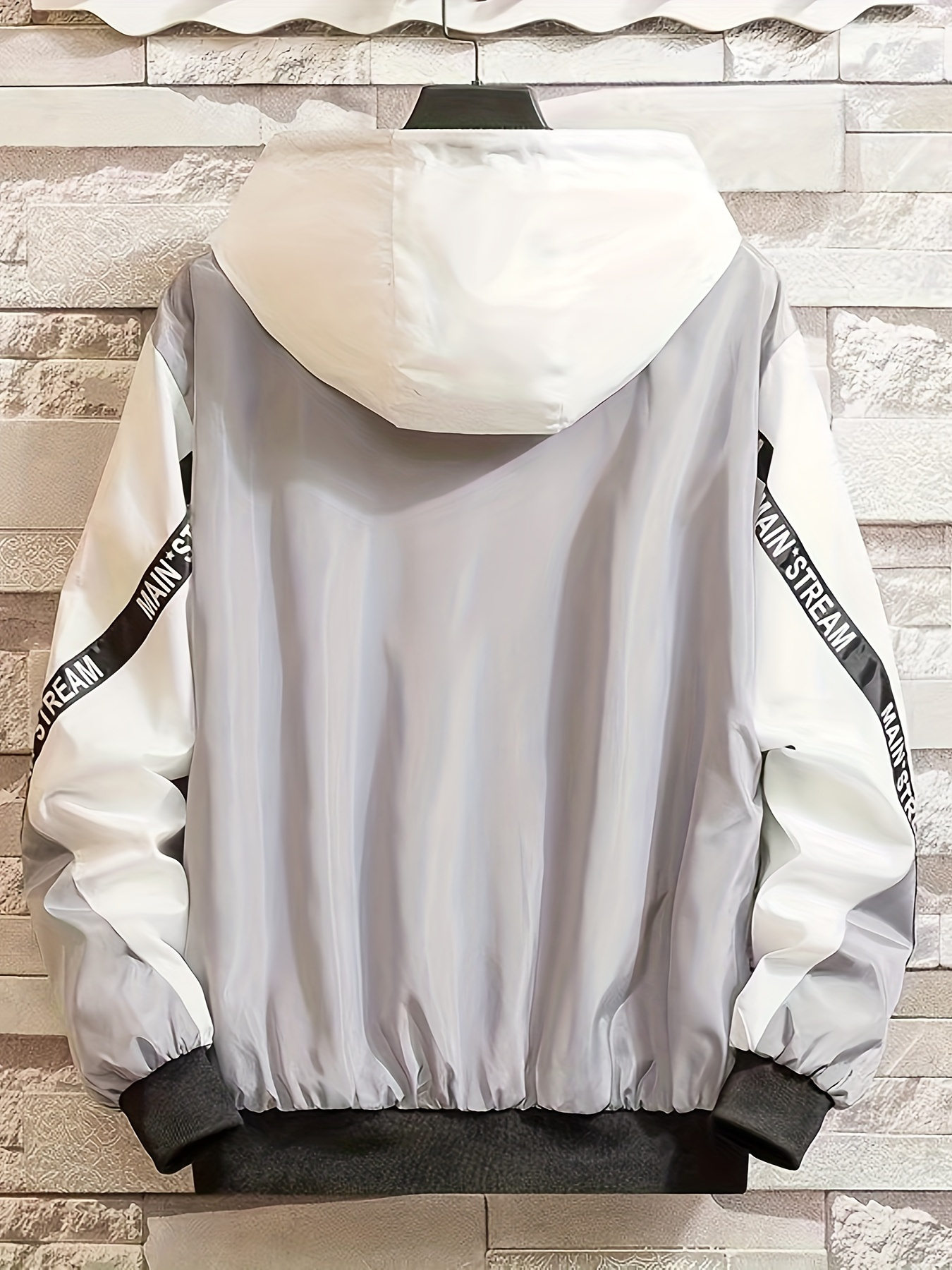 Men'S Color Block Hooded Trench Coat with Red/ Contrast Sleeves & Body - Casual Modern Jacket, Geometric Pattern, Regular Fit, Adjustable Hood & Zipper Closure, Versatile Outerwear for Teens & Young Adults, All-Season Durable Coat
