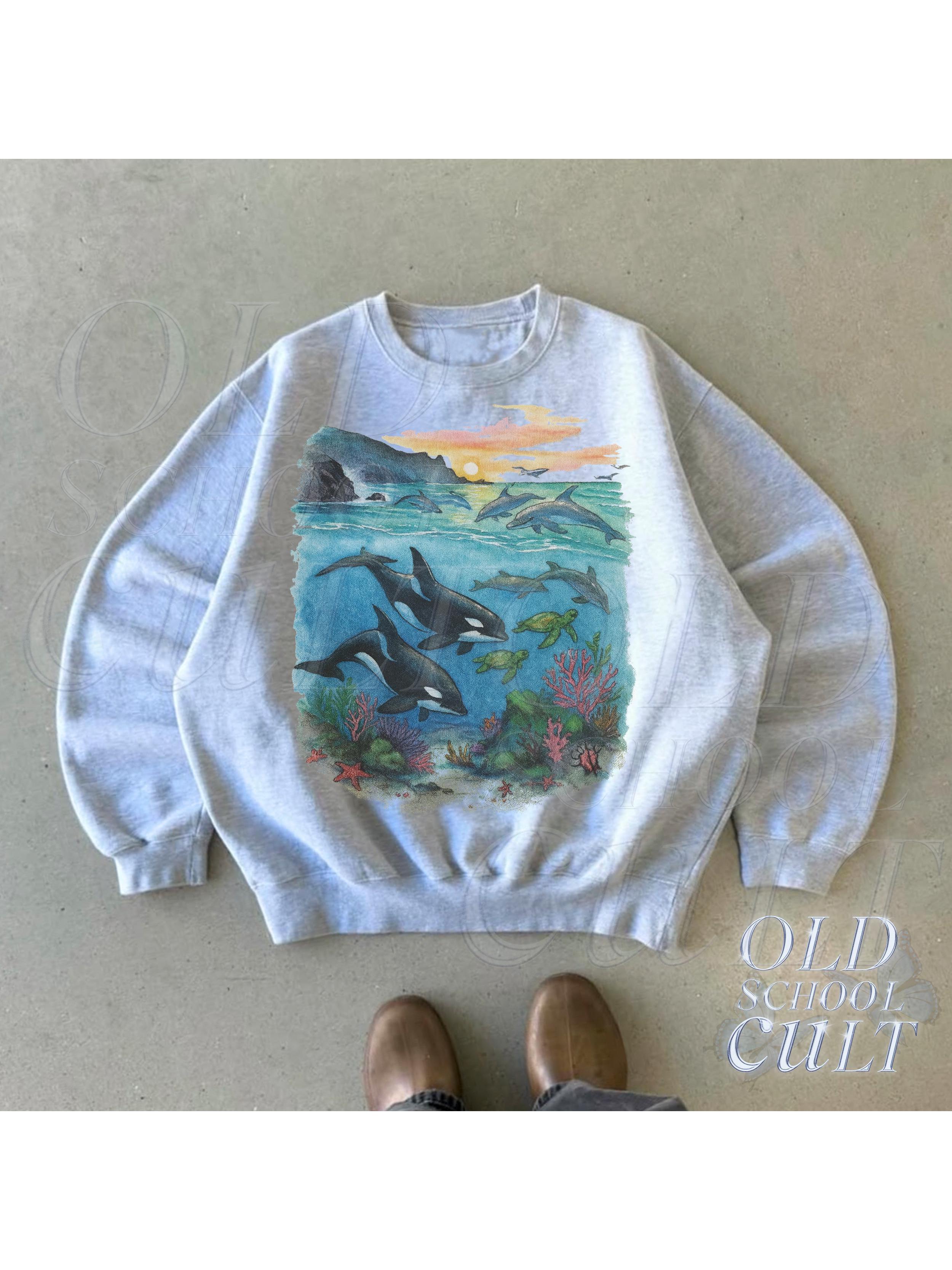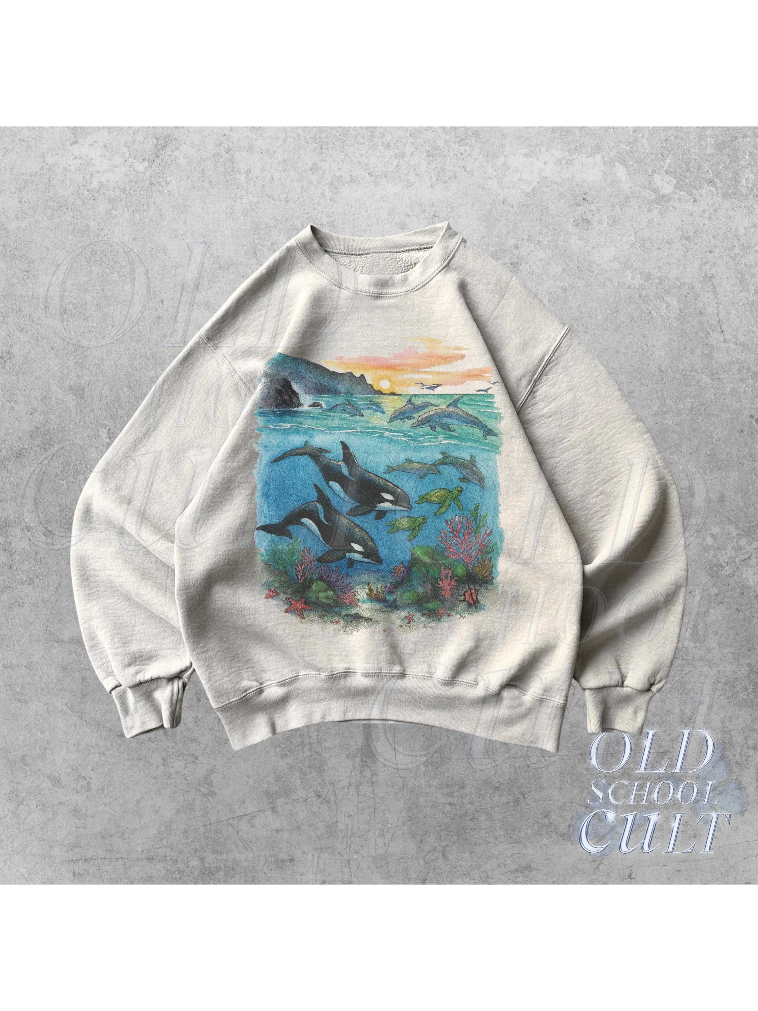 Orcas Sunset Sea Scene Vintage 90s Shipping Ornament, Retro Ocean Dolpin Sweater, Cute Sea Turtle Sweater, Ocean Gifts, Cozy Warm Unisex Sweater