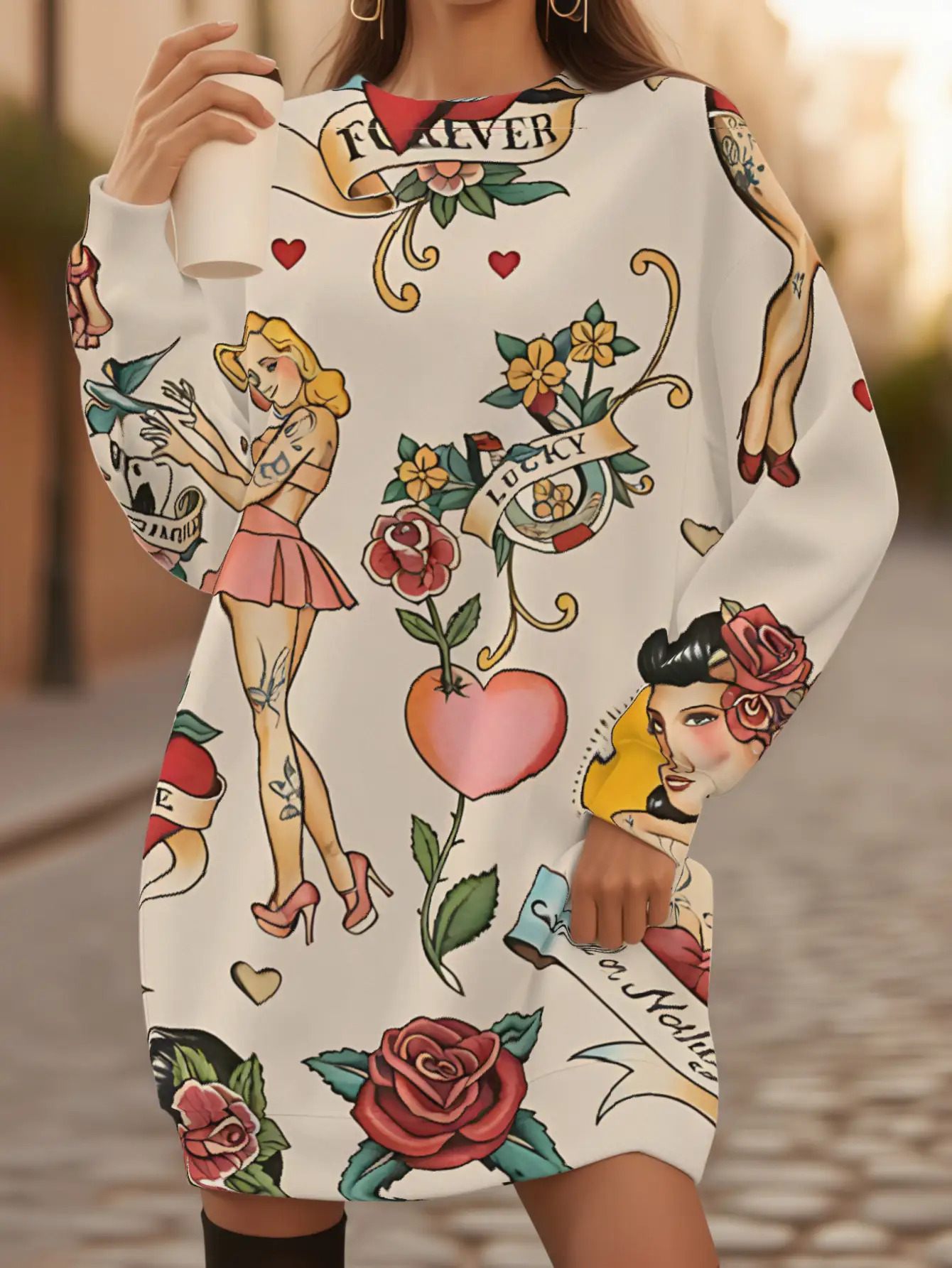 Plus Size Longline Sweatshirt for Women Featuring Vintage Tattoo Designs Like Roses And Hearts. This Machine Washable Pullover Is a Must-Have for Casual Streetwear in Any Season, Offering Retro Style And Easy Maintenance