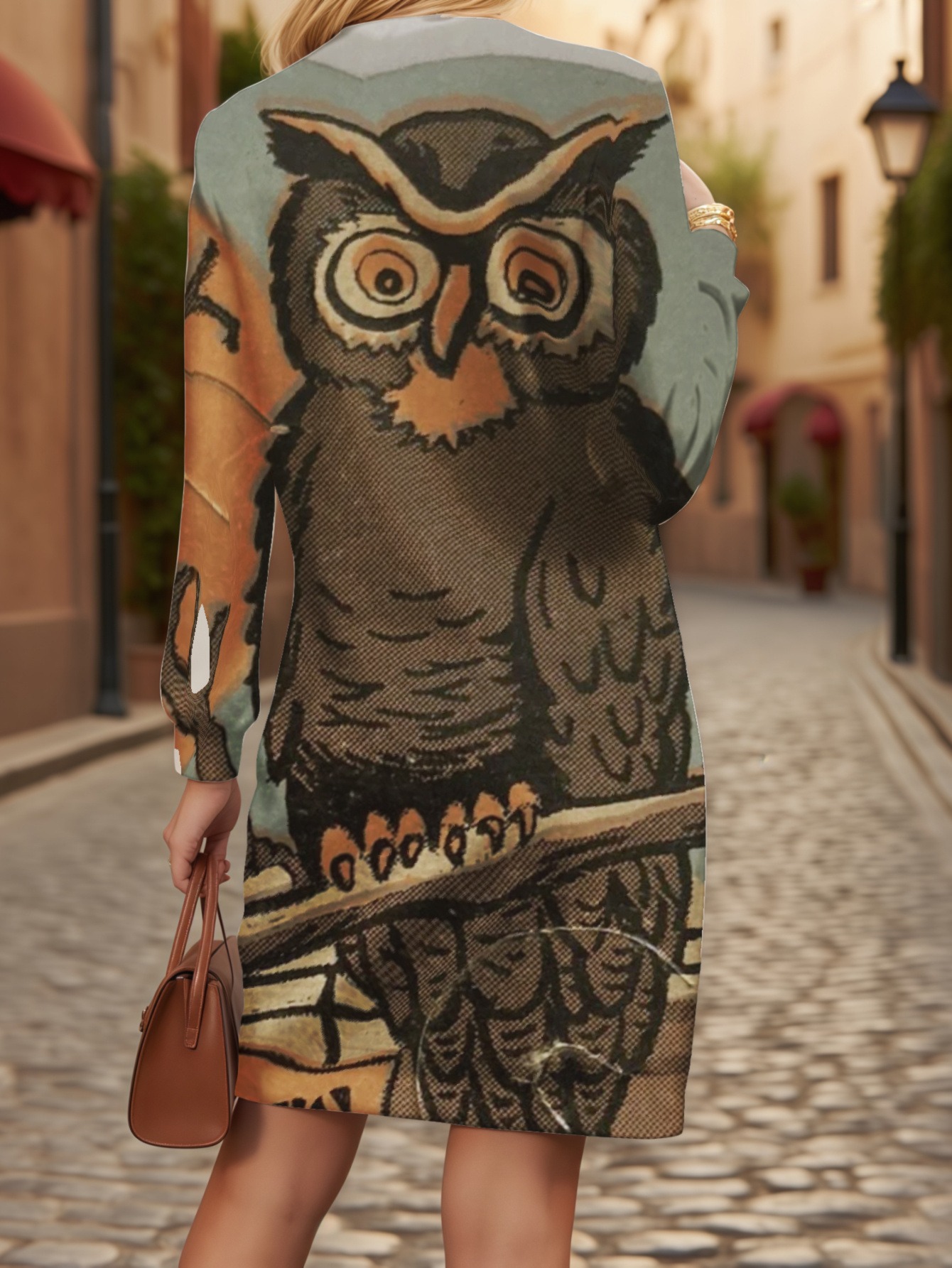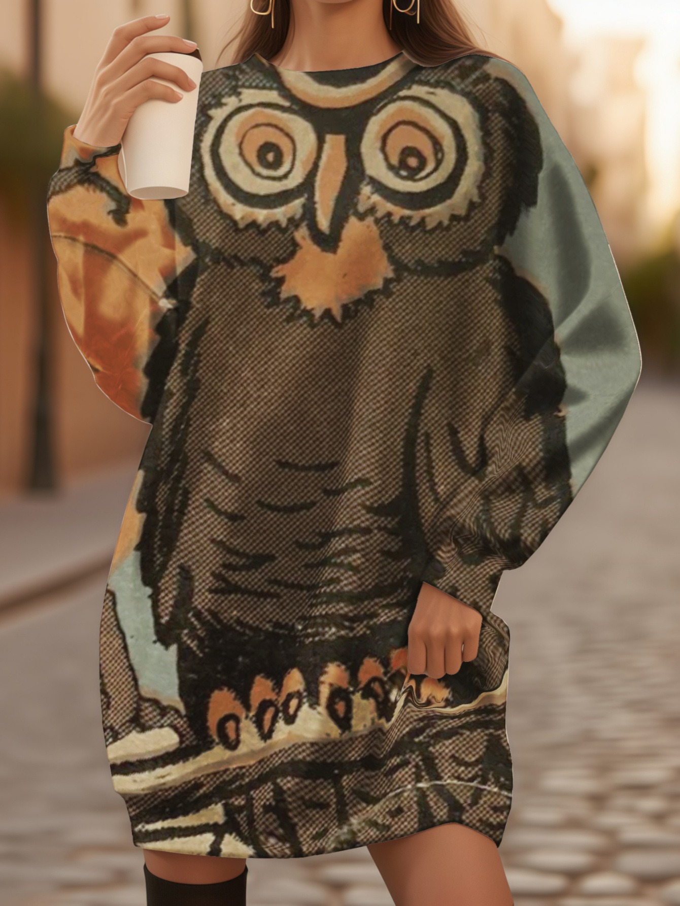 Women' Plus Size 3D Owl Print Sweater Dress - Oversized Loose Fit H-Line Silhouette, Owl Perched on Branches Full-Length Dress Suitable for Winter Parties, Christmas & for Halloween Costumes (Machine Washable)
